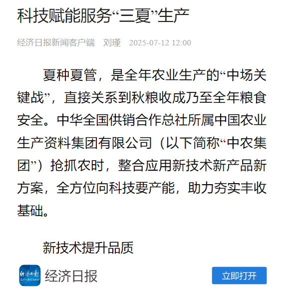夏種夏管,是全年農業生產的“中場關鍵戰”,直接關系到秋糧收成乃至全年糧食安全。中華全國供銷合作總社所屬中國農業生產資料集團有限公司(以下簡稱“中農集團”)搶抓農時,整合應用新技術新產品新方案,全方位向科技要產能,助力夯實豐收基礎。